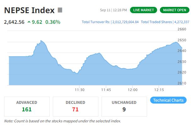 काठमाडौँ । केहि दिन यताको गिरावटको यात्रापछि आज बजारमा सुधार आएको छ । बजारमा आकर्षक सुधार आउँदा लगानीकर्ता उत्साहित भएका छन् भने कम्पनीहरुको शेयर मूल्य समेत बढेको हो । नेपाल स्टक एक्सचेञ्ज (नेप्से) ७८.१७ अकंले बढेर २६६६.३८ बिन्दुमा कायम...