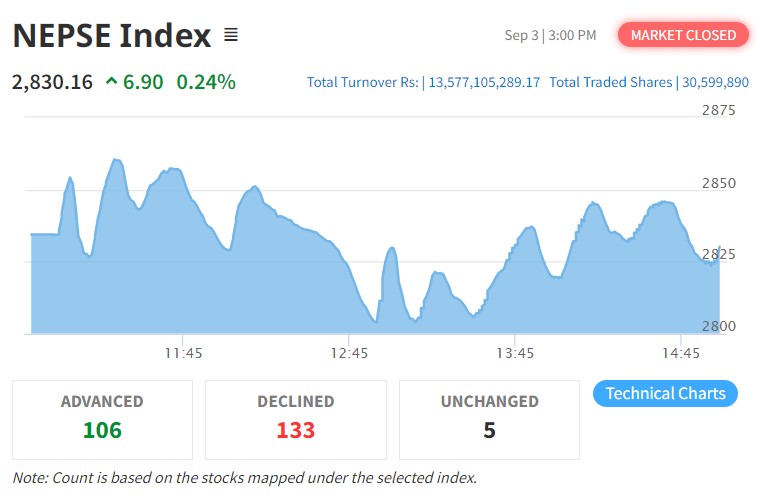 काठमाडौं । साताको तेस्रो दिन मंगलबार नेप्से परिसूचक ६.९० अंकले बढेर १८३०.१६ विन्दुमा कायम भएको छ । आज ३ करोड ५ लाख ९९ हजार ८९० कित्ता शेयर किनबेच हुँदा १३ अर्ब ५७ करोड ७१ लाख रुपैयाँ माथिको कारोबार भएको...