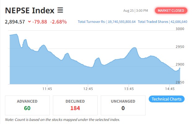 काठमाडौं । साताको पहिलो दिन आइतबार नेप्से परिसूचक ७९.८८ अंकले घटेर २८९४.५७ विन्दुमा कायम भएको छ । यस दिन ४ करोड २६ लाख ८६ हजार ६४० कित्ता शेयर किनबेच हुँदा १९ अर्ब ७४ करोड बढीको कारोबार भएको छ ।...