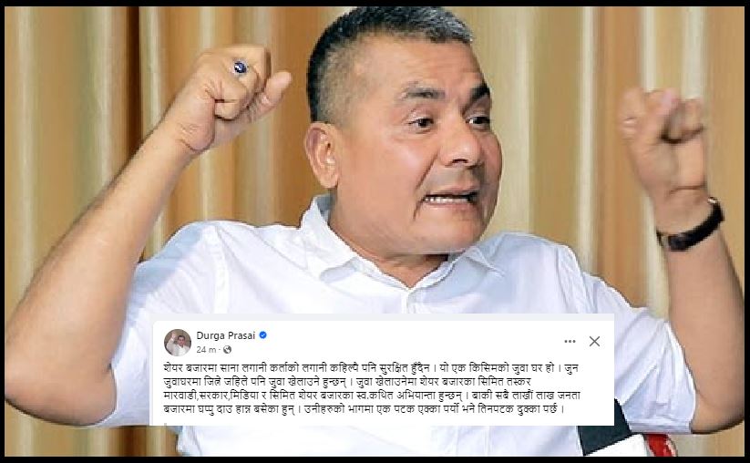 काठमाडौँ । ब्यवसायी दुर्गा प्रसाईले शेयर बजारप्रति गम्भिर आपत्ति जनाएका छन् । उनले समाजिक सञ्जाल फेसबुकमा एक स्टाटस लेख्दै पुँजी बजार जुवा घर रहेको बताएका हुन् । प्रसाईंले शेयर बजारमा साना लगानीकर्ताको लगानी कहिल्यै पनि सुरक्षित नहुने बताए ।...