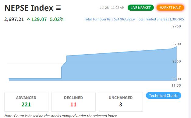 नेप्से ५ प्रतिशतले बढेपछि पुनः ४० मिनेटका लागि कारोबार बन्द