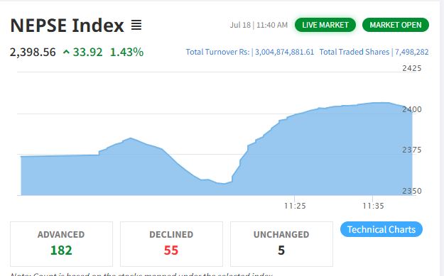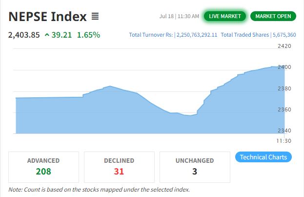 बुलको यात्रामा शेयर बजारः १२ अर्बको कारोबार हुँदा परिसूचक २३६४ बिन्दुमा, उत्साहित लगानीकर्ता