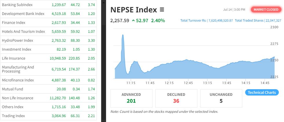 काठमाडौं । कारोबार साताको पहिलो दिन अर्थात आइतबार शेयर बजारमा हरियाली छाएको छ । नेप्से परिसूचक आज ५२.९७ अंकले बढेर २२५७.५९ को बिन्दुमा कायम भएको छ । शेयर बजार बढेसँगै आज कारोबार भएका २०१ कम्पनीहरुको शेयरमूल्यमा हरियाली छाएको छ...