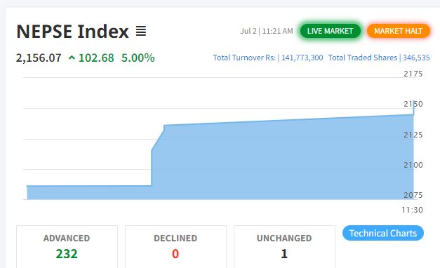 एमाले सरकारलाई शेयर बजारको हरियो कार्पेट, दोस्रो सर्किट ब्रेकसँगै ४० मिनेटका लागि कारोबार बन्द