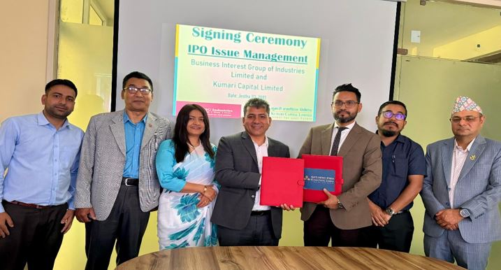 काठमाडौँ । बिजनेश इन्टरेष्ट ग्रुप अफ ईण्डष्ट्रिज लिमिटेडले प्रति शेयर १०० रूपैयाँ अंकित दरको ४५ लाख कित्ता साधारण शेयर सर्वसाधारणहरुमा निष्काशन गर्नको लागि कुमारी क्यापिटल लिमिटेडलाई धितोपत्र निष्काशन तथा बिक्री प्रबन्धकमा नियुक्त गरेको हो । उक्त सम्झौता—पत्रमा बिजनेश इन्टरेष्ट...