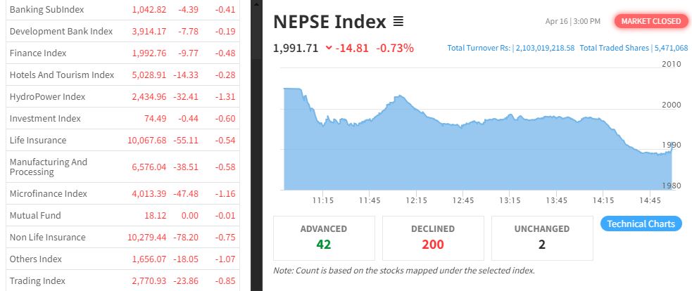 शेयर बजार दोहोरो अकंले घट्यो, १३ वटै उपसूचक राताम्य