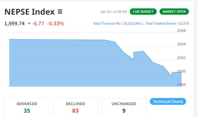 नयाँ वर्ष लागेदेखि शेयर बजारको ओरालो यात्रा, परिसूचक १९९१ बिन्दुमा पुग्दा कारोबार खुम्चियो