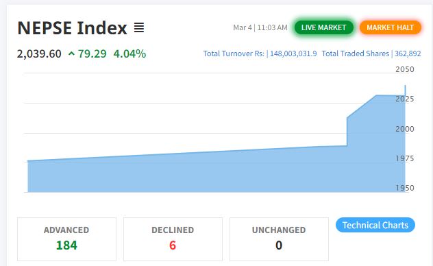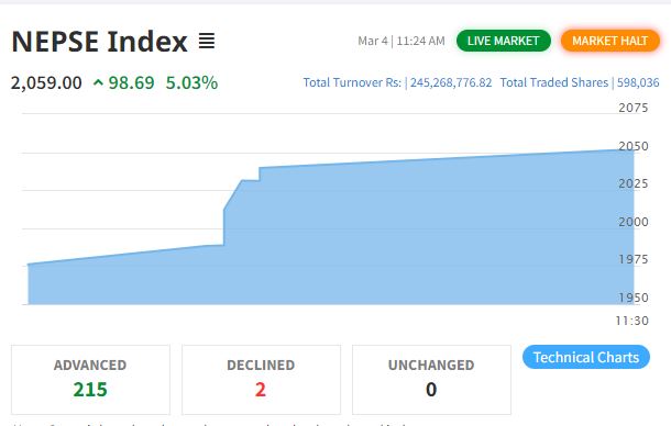 नेप्से ५ प्रतिशतले बढेपछि पुनः ४० मिनेटका लागि कारोबार बन्द