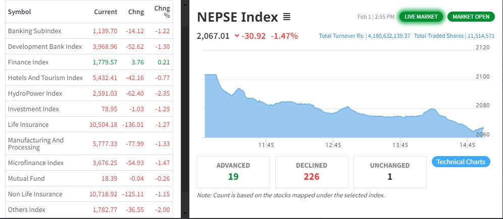नेप्से ३० अंकले घट्यो, फाइनान्स बाहेक सबै उपसूचक राताम्मे