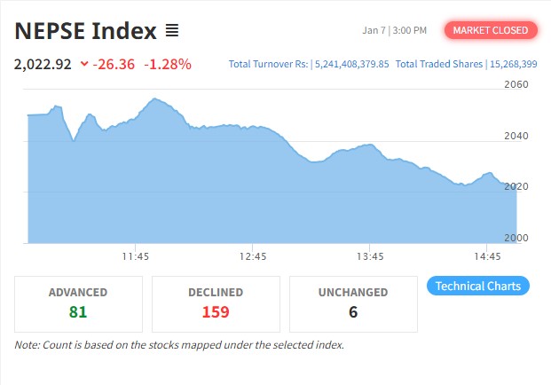 काठमाडौं । साता कारोबारको पहिलो दिन नेप्से दोहोरो अंकले घटेको छ। यस दिन नेप्से परिसूचक २६.३६ अंकले घटेर २०२२ को विन्दुमा कायम भएको हो । आज नेप्सेमा सूचीकृत ३०४ कम्पनीहरुको १ करोड ५२ लाख ६८ हजार ३९९ कित्ता किनबेच...