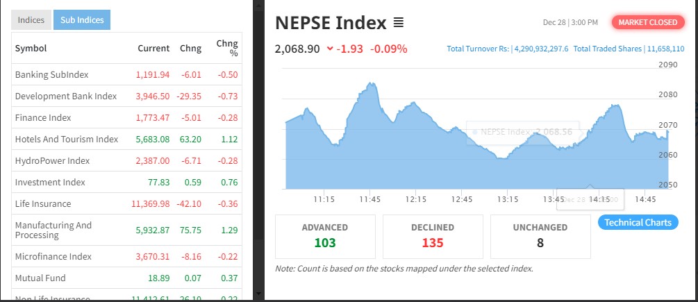 नेप्से झिनो अंकले घट्यो, ४ अर्बको शेयर कारोबार हुँदा उत्पादमूलक र होटलमा उछाल