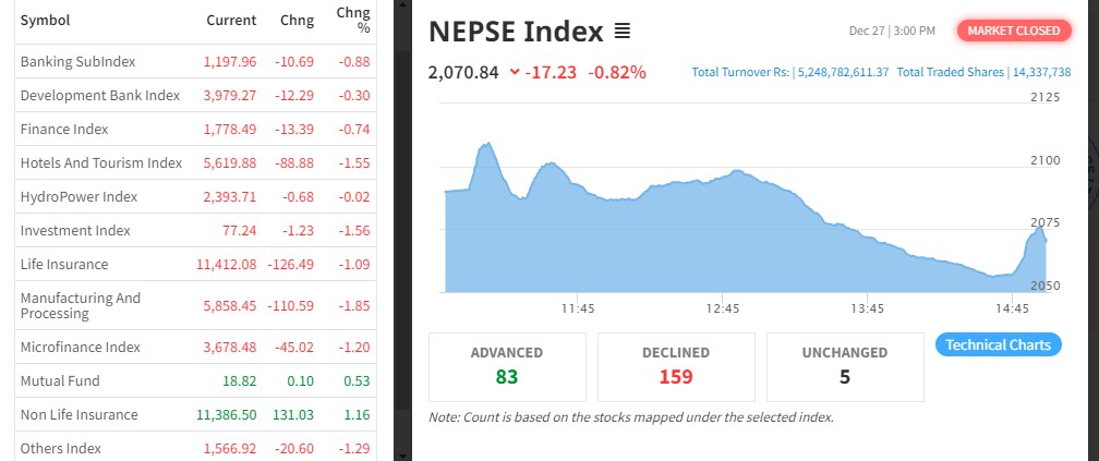 नेप्से १७ अंकले घट्यो, निर्जिवन बीमा र म्युचुअल फण्ड बाहेक सबै उपसूचक राताम्मे