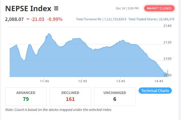 काठमाडौं । कारोबार साताको पहिलो दिन आइतबार शेयर बजार दोहोरो अंकले घटेको छ । कारोबारको सूरुवातिमा हरियाली छाएको नेप्से परिसूचकमा अन्तिममा दोहोरो अंकले घटेको हो । आइतबार नेप्से परिसूचक २१ दशमलव ०३ अंकले घटेर २०८८ दशमलव ०७ को विन्दुमा...