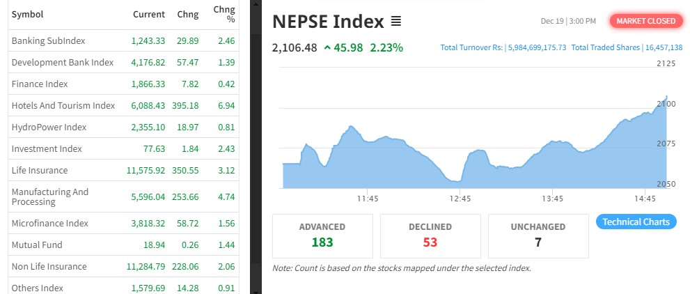 सेयर बजारमा उच्च अंकको वृद्धि, नेप्सेले नाघ्यो २१ सय विन्दु