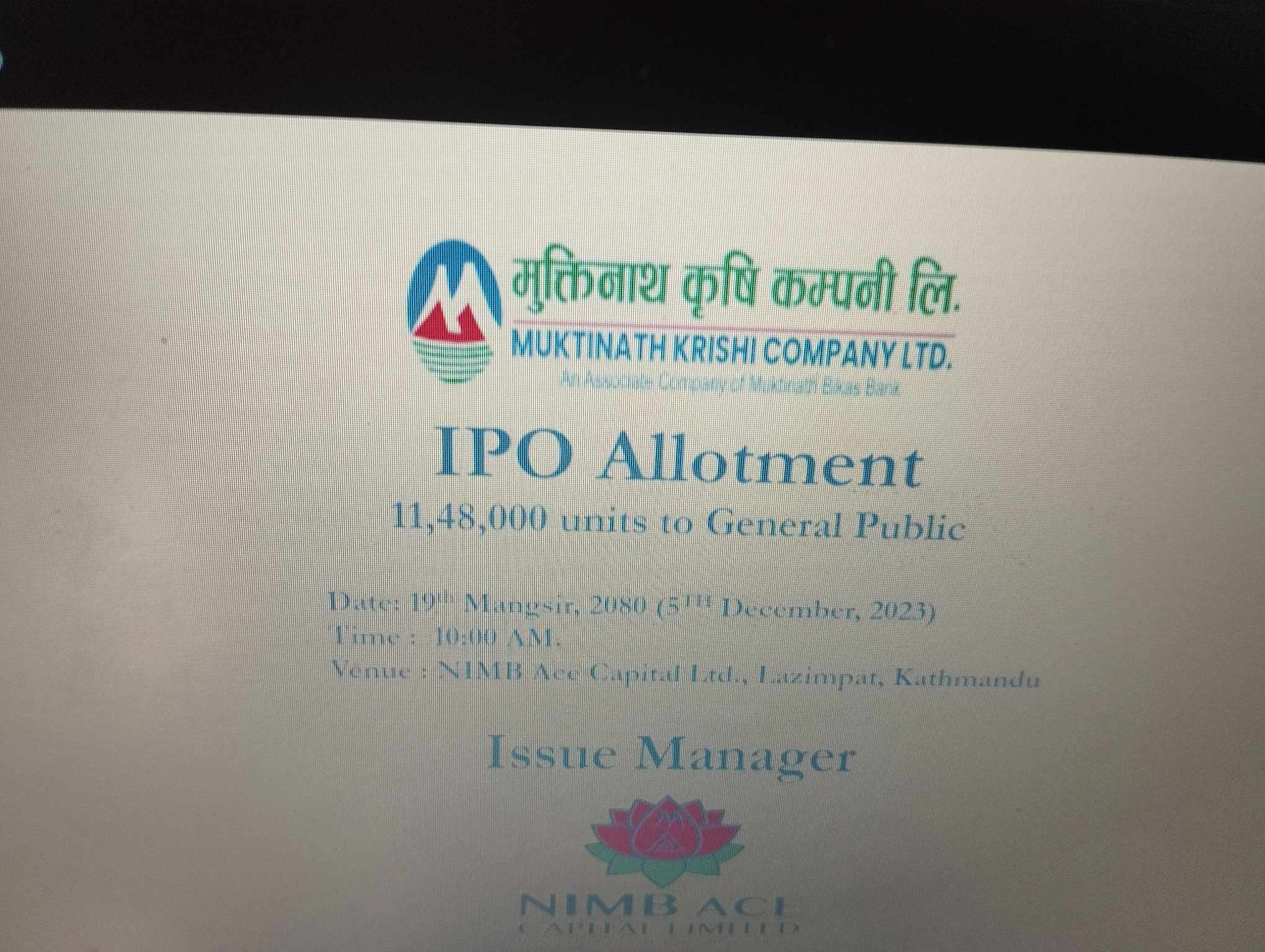 मुक्तिनाथ कृषि कम्पनीको आईपीओ आज बाँडफाँड हुँदै, १२ लाखको हात खाली