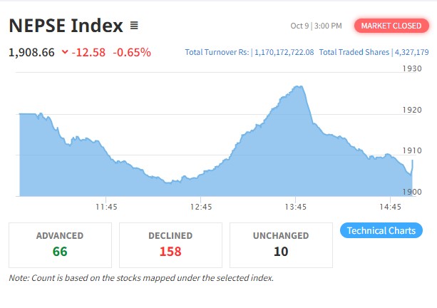 काठमाडौं । साता कारोबारको पहिलो दिन आईतबार ३५ अंकले घटेको नेप्सेमा आज दोस्रो दिन सोमबार पनि दोहोरो अंकको गिरावट आएको छ । आज नेप्से उपसूचक १२ अंकले घटेर १९०८ को विन्दुमा कायम भएको छ । आज ४३ लाख २७...