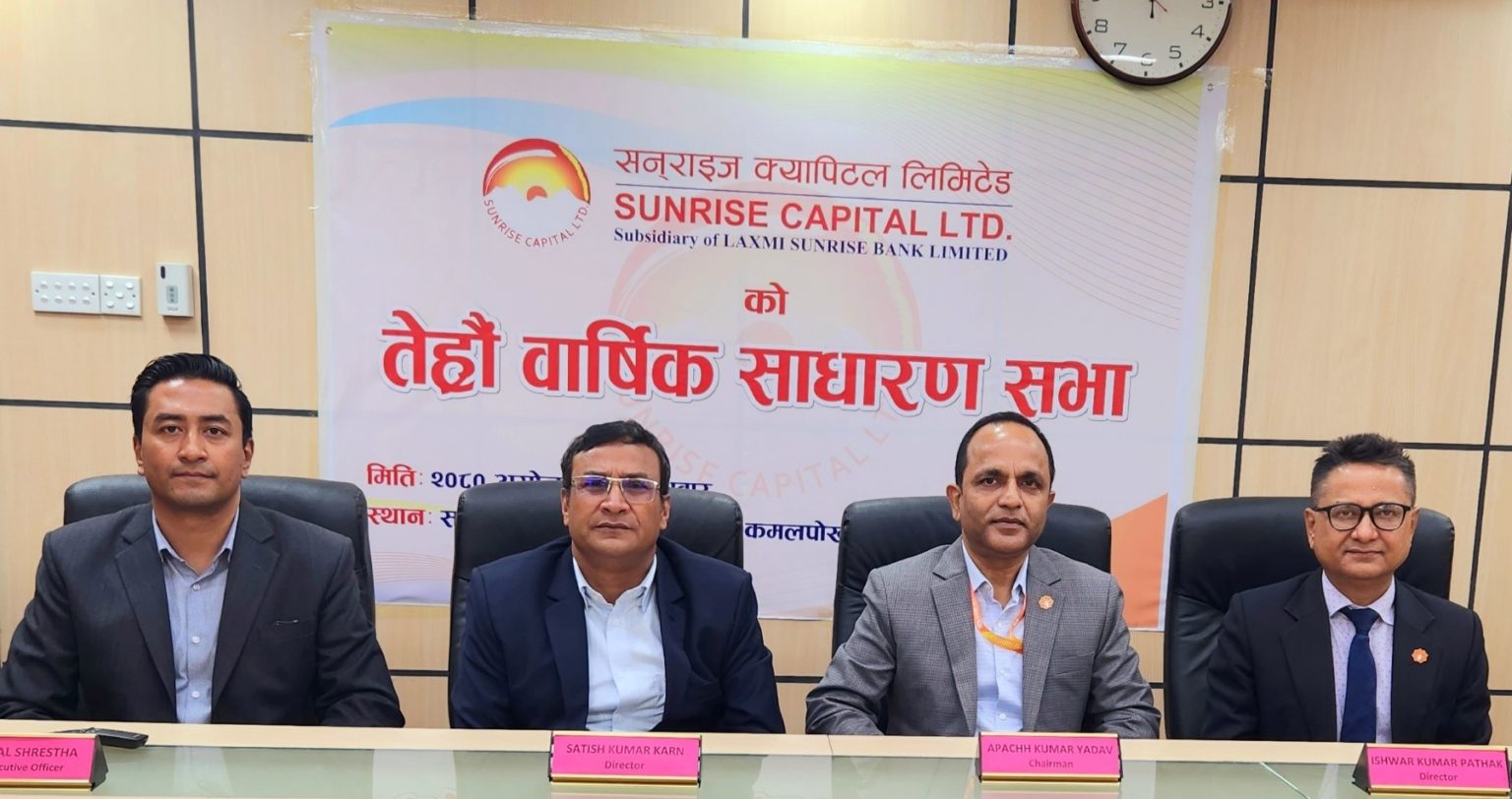 सनराइज क्यापिटल लिमिटेडले ३० प्रतिशत नगद लाभांश पारित गर्दै १३ औं वार्षिक साधारणसभा बुधबार सम्पन्न गरेको छ । वार्षिक साधारणसभामा प्रस्तुत भएका सामान्य प्रस्तावहरुमा आव २०७९र८० को वार्षिक प्रतिवेदन, सोही अवधिको असार मसान्तको बासलात, नाफा–नोक्सान हिसाब, नगद प्रवाह विवरण...