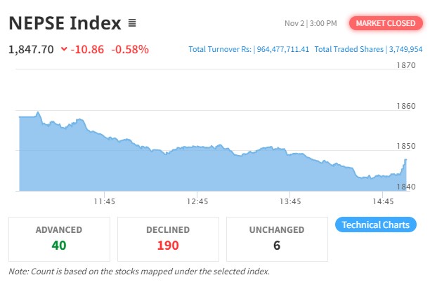 काठमाडौं । साता कारोबारको अन्तिम दिन बिहीबार नेप्से दोहोरो अंकले घटेको छ । नेप्सेमा १० अंकको गिरावट आउँदा १९० कम्पनीहरुको शेयरमूल्य घटेको छ । आज नेप्से उपसूचक ०.५८ प्रतिशतले घटेर १८४७.७० को विन्दुमा कायम हुन पुगेकोे छ । आज...