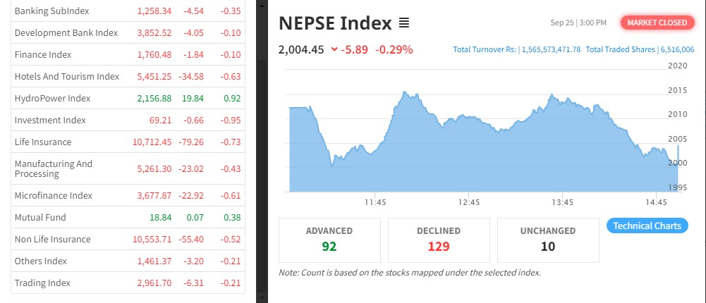 कठमाडौं । साता कारोबारको दोस्रो दिन शेयर बजार सामान्य अंकले घटेको छ । कारोबारको अघिल्लो दिन दोहोरो अंकले घटेको शेयर बजार आज ५ अंकले घटेर २००१ को बिन्दुमा कायम भएको छ । शेयर बजार बजार सामान्य अंकले घटेतापनि सन...
