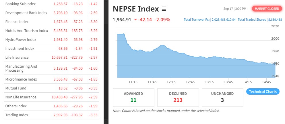 ४२ अंकले घट्यो नेप्से, २१३ कम्पनीको शेयरमूल्यमा गिरावट