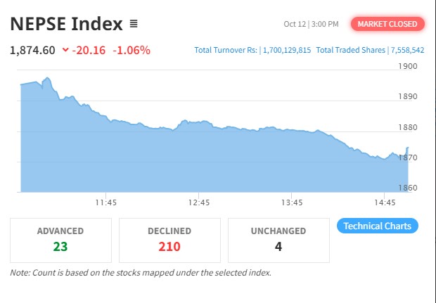 काठमाडौं । साता कारोबारको अन्तिम दिन नेप्से परिसूचक २० अंकले घटेर १८७४ को विन्दुमा कायम भएको छ । नेप्से गत मंगलबार देखि अठार सयको विन्दुबाट माथि उक्लन नसकेको हो । आज ७५ लाख ५८ हजार ५४२ कित्ता शेयर किनबेच...