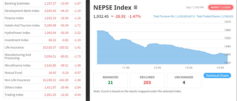 २८ अंकले घट्यो नेप्से, २०३ कम्पनीको शेयरमूल्यमा गिरावट