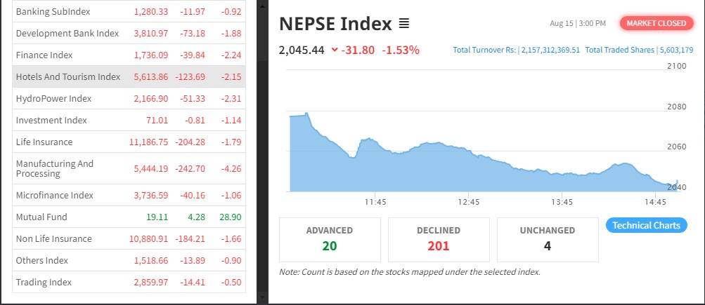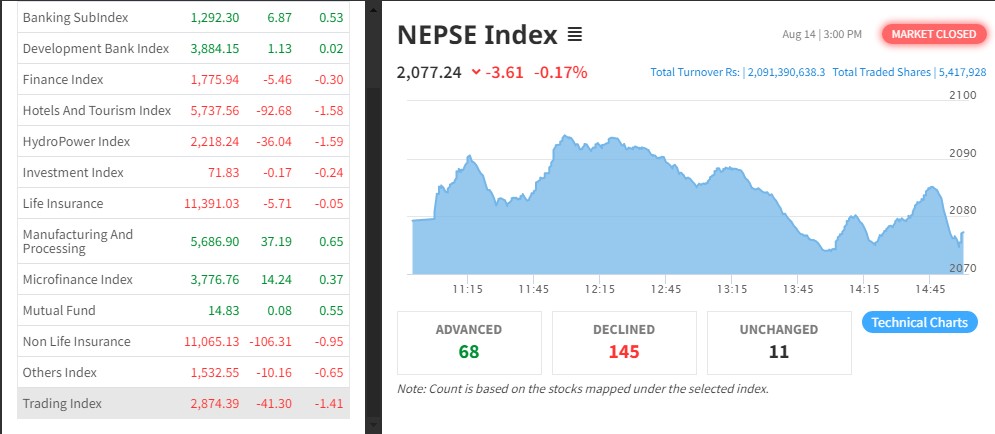 नेप्सेमा झिनो अंकको गिरावट, ६८ कम्पनीको शेयरमूल्य बढ्दा १४५ को घट्यो