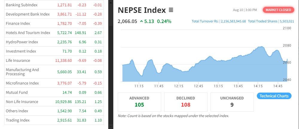 पाँच अंकले बढ्यो नेप्से, कारोबार रकम दुई अर्ब माथि