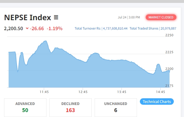 मौद्रिक नीतिले उचालिएको शेयर बजार आज २६ अंकले घट्यो, अधिकांश उपसूचक राताम्मे