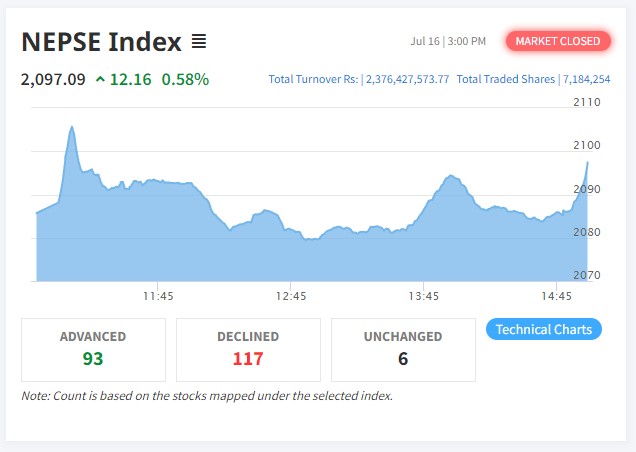 काठमाडौं । साताको पहिलो दिन आइतबार नेपाल स्टक एक्सचेन्ज नेप्से १२.१६ अंकले बृद्धि भई २०९७.०९ कायम भएको छ । यद्यपि बजारमा आशा गर्ने अवस्था भने छैन । साताको पहिलो दिन कारोबार सुरु भए लगत्तै ह्वात्तै बढेको देखिए पनि दिनभर...