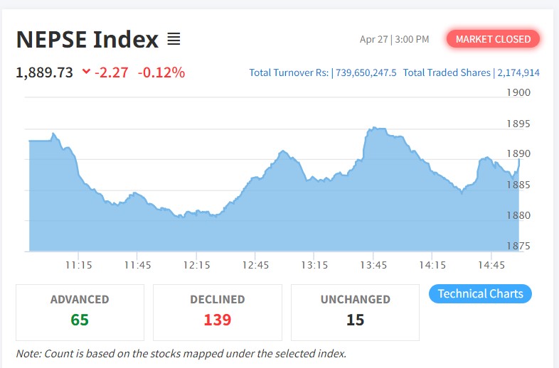 काठमाडौं । साता कारोबारको अन्तिम दिन शेयरबजारमा झिनो अंकको गिरावट आएको छ । नेप्से परिसूचक आज २.२७ अंकले घटेर १८८९ को विन्दुमा कायम हुन पुगेको छ । केही दिनयता लगानीकर्ताहरु शेयरबजार प्रति निरुत्साही बन्दा शेयरबजारको अवस्था झनै नाजुक हुँदै...