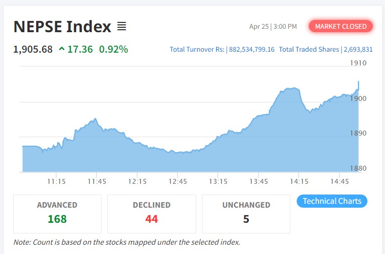 शेयरबजारमा छायो हरियाली, १२ उपसूचक बढ्दा समेत कारोबार ८८ करोडमा सीमित