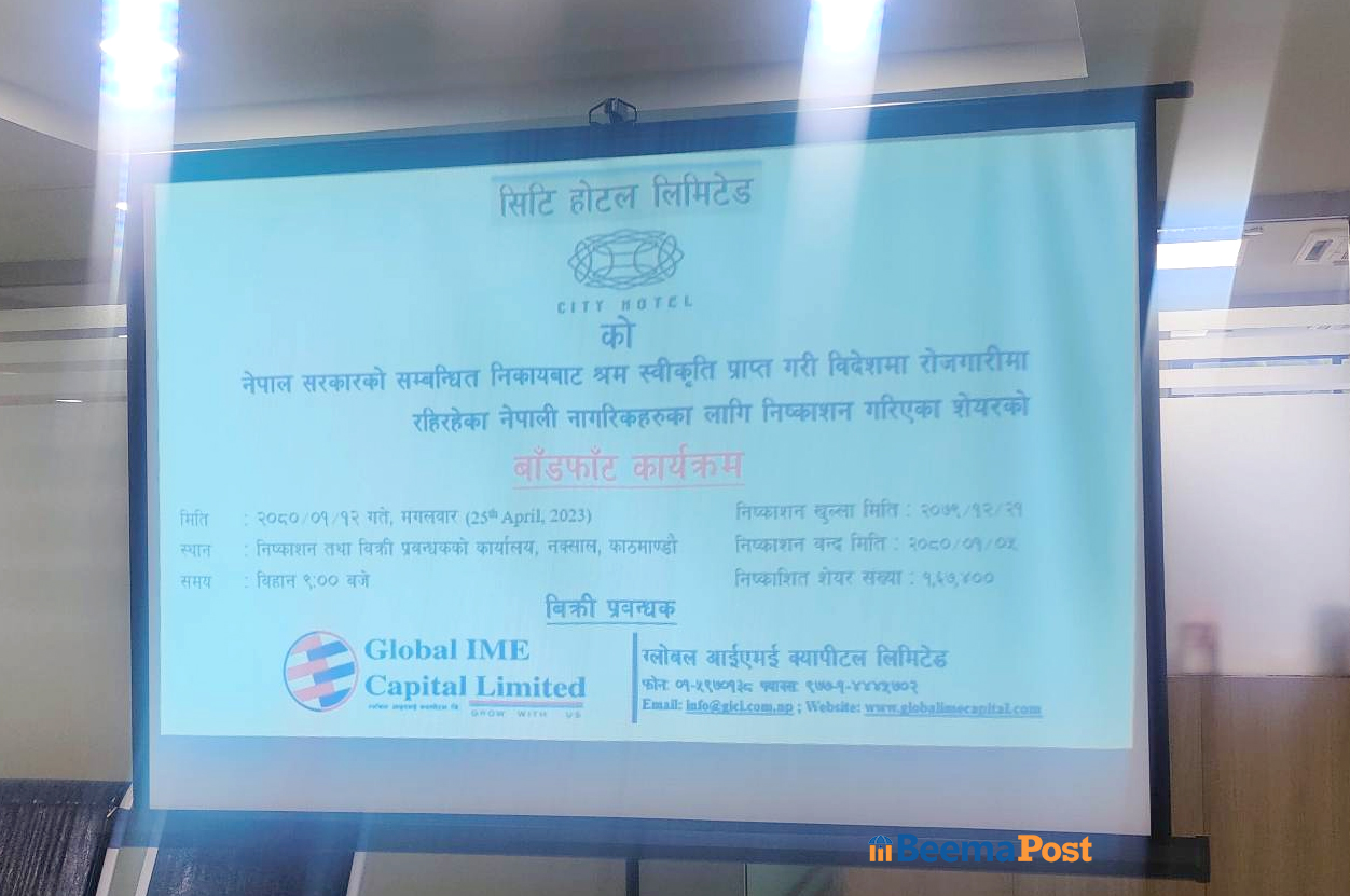काठमाडौं । सिटि होटल लिमिटेडको आईपीओ आज बाँडफाँड भएको छ । बिक्री प्रबन्धक ग्लोबल आइएमई क्यापिटलको कार्यालयमा आज बिहान बाँडफाँड सम्पन्न भएको हो । होटलले नेपाल सरकारको सम्बन्धित निकायबाट श्रम स्वीकृति प्राप्त गरी विदेशमा रोजगारीमा रहेका नेपाली नागरिकहरुका लागि...