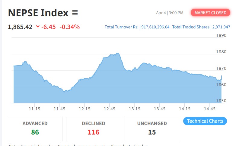 शेयरबजारमा सामान्य अंकको गिरावट, सात उपसूचकमा छायो हरियाली