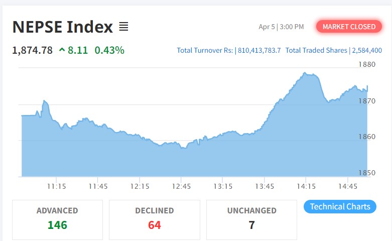 काठमाडौं । साता कारोबारको चौथो दिन अर्थात बुधबार शेयर बजार झिनो अंकले बढेको छ । आज शेयर बजार ८।३९ अंकले बढेर १८७५ को विन्दुमा कायम भएको छ । शेयर बजारमा हरियाली छाएसँगै कालिन्चोक दर्शन लिमिटेडको शेयर मूल्यमा सर्किट लागेको...