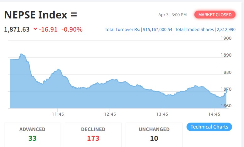१६ अंकले घट्यो नेप्से, हाइड्रोपावर उपसूचक सर्वाधिक घट्दा कारोबार ९१ करोडमा सीमित