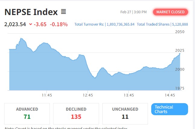 काठमाडौं । साताको दोस्रो दिन शेयरबजारमा सामान्य अंकको गिरावट आएको छ । नेप्से सूचक ३.६५ अंकले घटेर २०२३ को विन्दुमा कायम हुन पुगेको छ । शेयरबजार घटेसँगै आज कारोबार रकम समेत घटेर एक अर्ब ८९ करोडमा सीमित भएको छ...