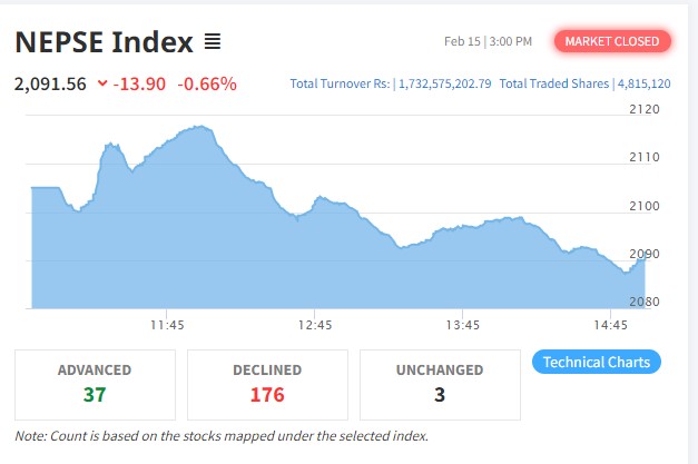 नेप्सेमा १३।९० अंकको गिरावट आँउदा एक उपसूचक बाहेक सबै राताम्मे, १ अर्ब ७३ करोड रुपैयाँको शेयर कारोबार