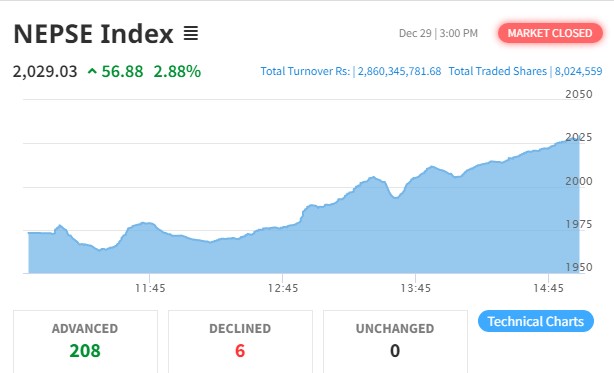 नेप्से इन्डेक्स २ हजारको विन्दुमा, ५६ अंकले शेयरबजार बढ्दा पौने ३ अर्बको कारोबार