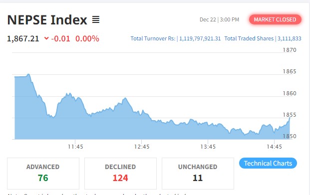काठमाडौं । साता कारोबारको अन्तिम दिन शेयरबजारमा झिनो अंकको गिरावट आएको छ । आज नेप्से सूचक ०.०१ अंकले घटेर १८६७ विन्दुमा कायम भएको छ । नेप्से सूचक घटेपनि आज एक अर्ब ११ करोड ९७ लाख रुपैयाँमाथिको कारोबार भएको छ...