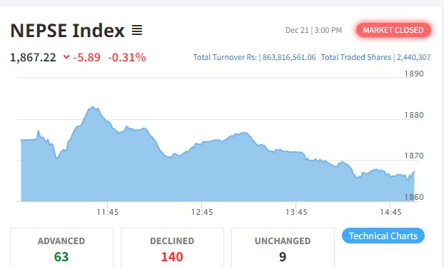 शेयरबजारमा झिनो अंकको गिरावट, ८६ करोडमाथिको कारोबार