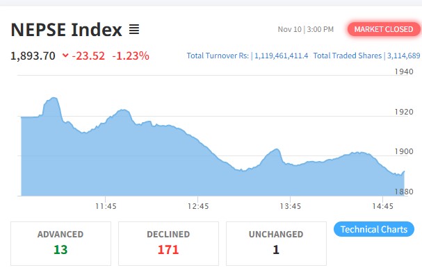 साताको अन्तिम दिन सेयर बजार दोहोरो अंकले ओरालो लाग्यो