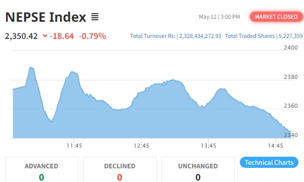 काठमाडौं । स्थानिय तहको निर्वाचनको अघिल्लो कारोबार एवं यो साता अन्तिम कारोबारको दिन नेप्से १८ दशमलव ६४ अंकले घट्दा २३५०।४२ को विन्दुमा कायम भएको छ । यो साताको सुरुवाती दिनदेखि लगातार तीन दिन हरीयाली छाईरहेको शेयर बजारमा आज गिरावट...