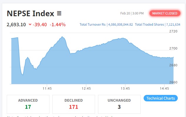 राष्ट्र बैंकले शेयर बजारलाई अनुत्पादक क्षेत्रमा गणना गर्ने त्रासले ३९ अंकले घट्यो नेप्से