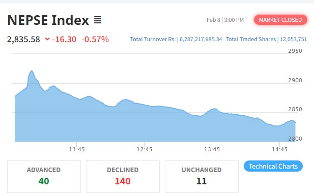 उतारचढावकाबीच १६ अंकले घट्यो नेप्से, ५ उपसूचकमा हरियाली छाउँदा ६ अर्बमाथिको कारोबार