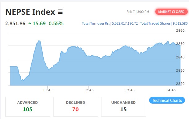 नेप्से १५ अंकले बढ्दा कारोबार ५ अर्बमा सीमित, १० उपसूचकमा छायो हरियाली