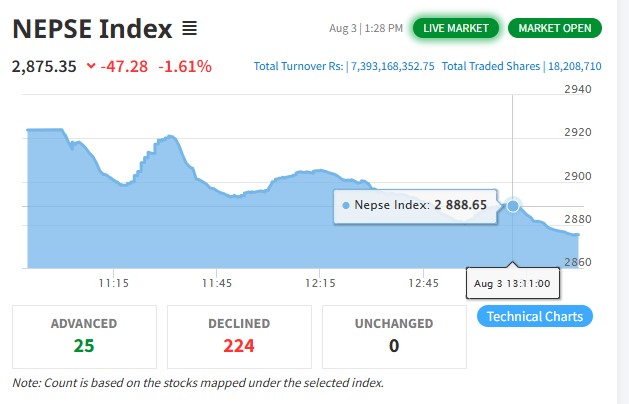 शेयर बजारमा पहिरो, ६५ अंकले घटेर २८ सयको बिन्दुमा कायम