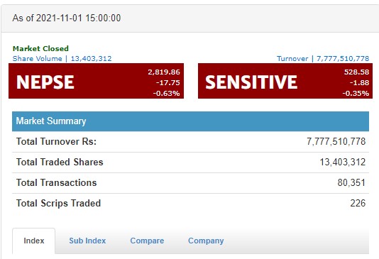 नेप्से १७ अंकले घट्दा ७ अर्बमाथिको कारोबार, ३ उपसूचक बाहेक सबै राताम्य