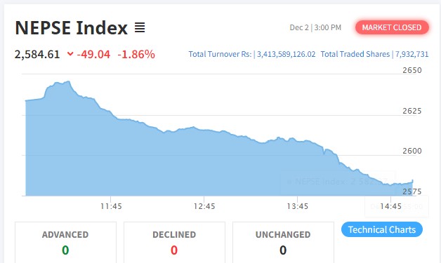 नेप्सेमा ४९ अंकको गिरावट, सबै उपसूचक राताम्य हुँदा ३ अर्बमा खुम्चियो कारोबार