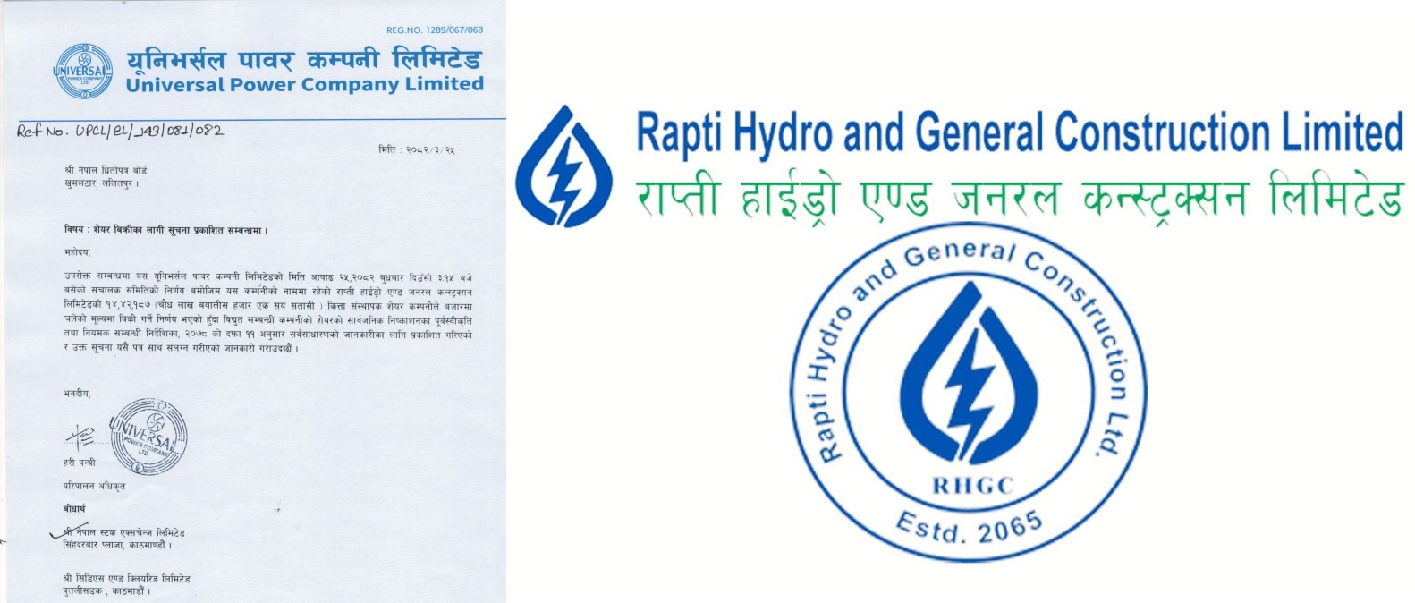 युनिभर्सल पावरले राप्ती हाइड्रोको साढे १४ लाख कित्ता शेयर बेच्ने